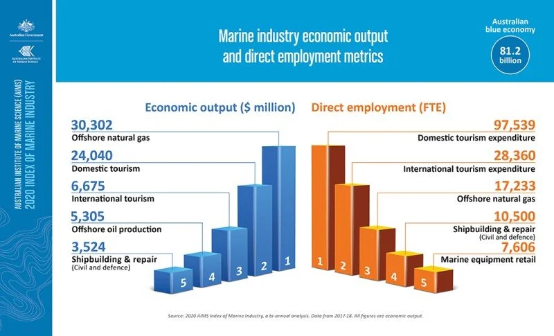 The latest AIMS Index of Marine Industry report, released in July 2021, celebrates a 28% increase in the total value of Australia’s marine industry, rising to $81.2bn between 2016-18. A 79% increase in offshore natural gas production fuels this growth followed by a 57% increase in shipbuilding and repair. Over $35bn of the total $81.2bn Australian blue economy is supported by offshore petroleum projects.